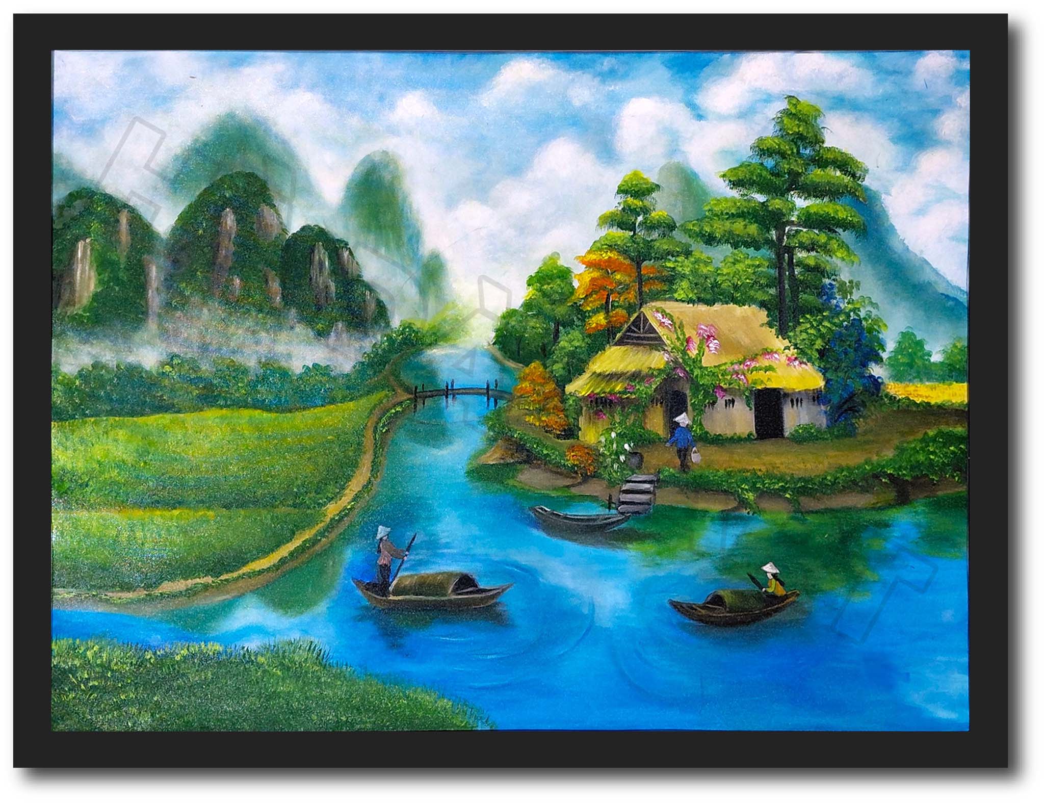 Bức tranh đưa người xem về với một miền quê Việt Nam thanh bình và thơ mộng. Dòng sông xanh biếc uốn lượn quanh những thửa ruộng, xa xa là dãy núi trập trùng ẩn hiện trong sương sớm. Ngôi nhà tranh đơn sơ nép mình bên những rặng cây xanh tạo nên một khung cảnh ấm cúng. Hình ảnh những con người trong chiếc nón lá trên chiếc thuyền nhỏ lặng lẽ trôi. Tất cả gợi lên một cảm giác yên ả, mộc mạc và đầy hoài niệm về một miền quê yêu dấu.
