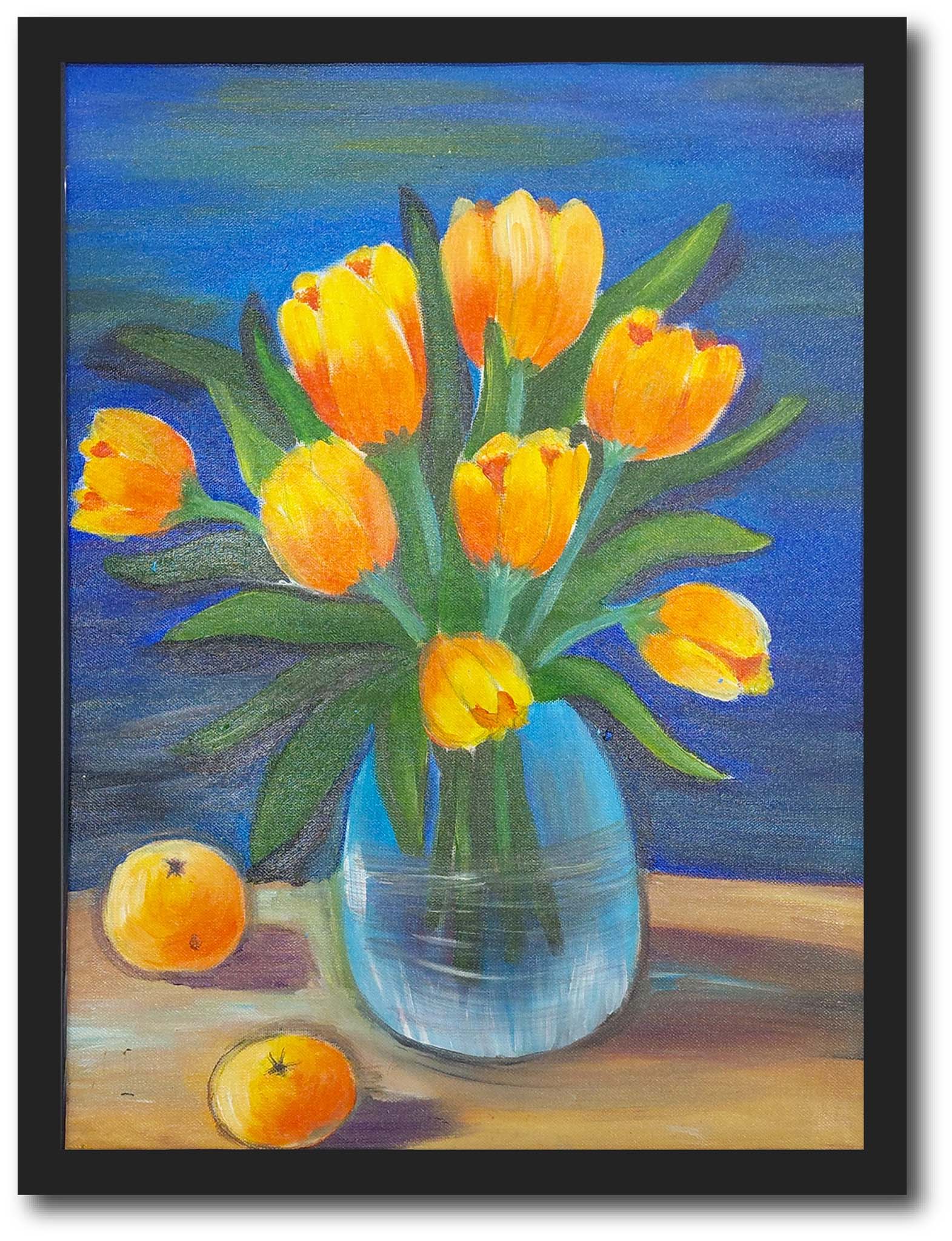 Bức tranh tĩnh vật này tràn ngập ánh nắng với những bông hoa tulip màu cam rực rỡ. Chúng được cắm trong một chiếc bình thủy tinh xanh nhạt, để lộ những стебли xanh tươi bên trong. Hai quả cam chín mọng được đặt hờ hững trên mặt bàn gỗ nâu, tạo thêm sự tươi tắn và sinh động cho композиция. Nền xanh dương đậm làm nổi bật vẻ ấm áp của những bông hoa và quả. Bức tranh mang đến một cảm giác vui vẻ, tràn đầy năng lượng và sức sống của mùa xuân.