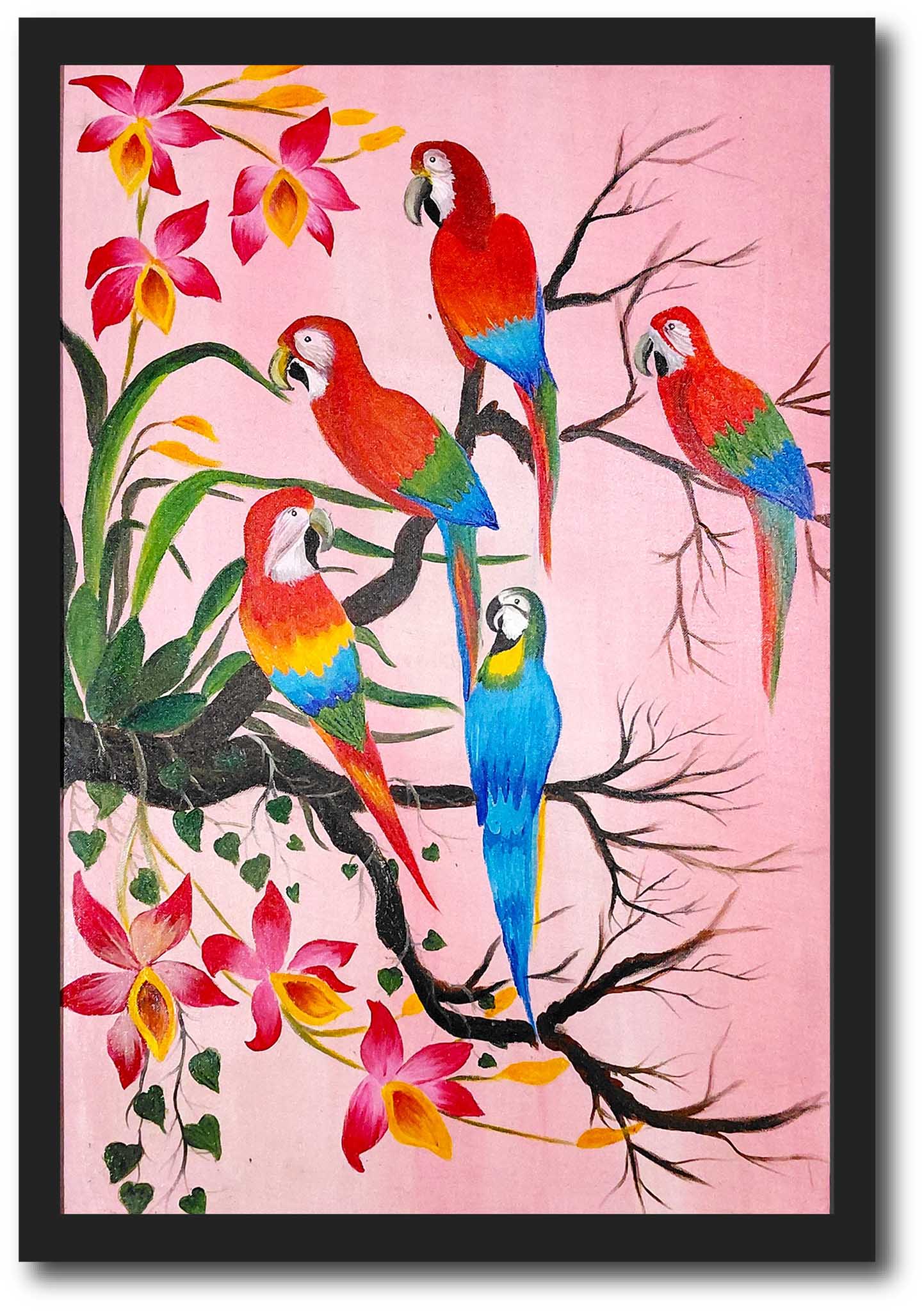 Tác phẩm là một bức tranh sinh động và rực rỡ với hình ảnh năm chú vẹt sặc sỡ đang đậu trên cành cây. Mỗi chú vẹt mang một bộ lông với sự pha trộn màu sắc độc đáo và bắt mắt. Xung quanh là những bông hoa lan màu hồng và những chiếc lá xanh tươi, tạo nên một không gian nhiệt đới đầy sức sống. Bức tranh sử dụng những đường nét uyển chuyển và màu sắc tươi sáng, thể hiện vẻ đẹp tự do và hoang dã của loài chim này. Đây là một tác phẩm mang đến cảm giác vui tươi và tràn đầy năng lượng.